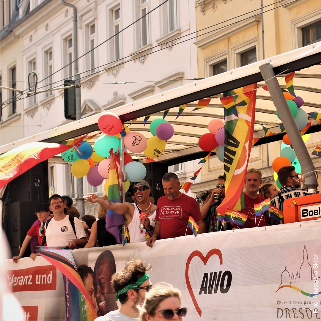Der CSD Dresden ist mehr als nur ein buntes Straßenfest: Er ist eine politische Demonstration für Menschenwürde, Geschlechtergerechtigkeit und gesellschaftliche Teilhabe. Seit acht Jahren stehen wir als AWO Sachsen Seite an Seite mit dem CSD Dresden und gestalten aktiv mit – ob mit eigenem Truck beim Demoumzug, mit Informationsständen oder durch gemeinsame Aktionen mit dem AWO Landesjugendwerk.