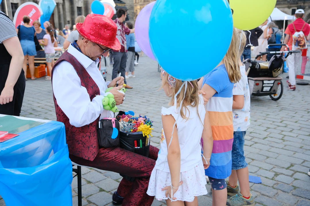 Unser besonderer Gast Twister Fuchsi war wie in den vergangenen Jahren ebenfalls dabei und begeisterte die Kinder mit seinen Luftballonfiguren. Apropos Luftballons: Die Kolleg:innen des Freiwilligendienstes haben sich besonders engagiert, damit jedes Kind einen AWO-Luftballon gewinnen konnte. Es gab natürlich Buttons für Alle (danke Jugendwerk der AWO Sachsen!), anregende Gespräche und leckeres Essen. Vielen Dank an alle, die sich an diesem Fest der Demokratie und der Vielfalt beteiligt haben!