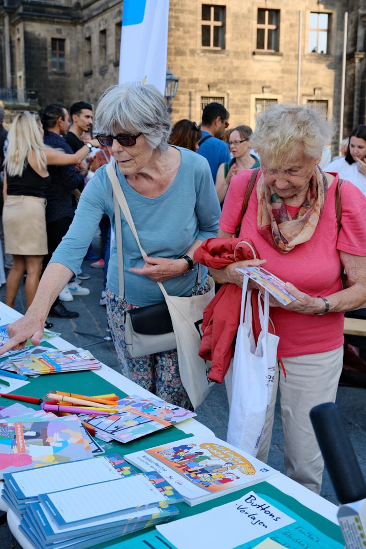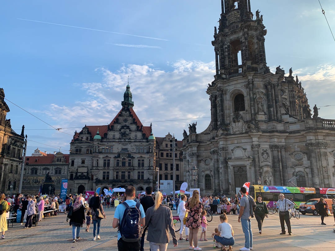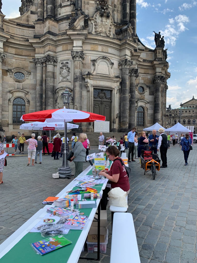 Am 5. September 2022 fand das Gastmahl „Dresden is(s)t bunt“ an einem besonderen Ort statt: Von 16 bis 20 Uhr waren wir auf der Augustusbrücke und dem Schloßplatz und eine lange Festtafel aufgebaut. Alle gastfreundlichen Menschen Dresdens waren herzlich eingeladen, daran Platz zu nehmen, Essen und Getränke zu teilen und miteinander ins Gespräch zu kommen.