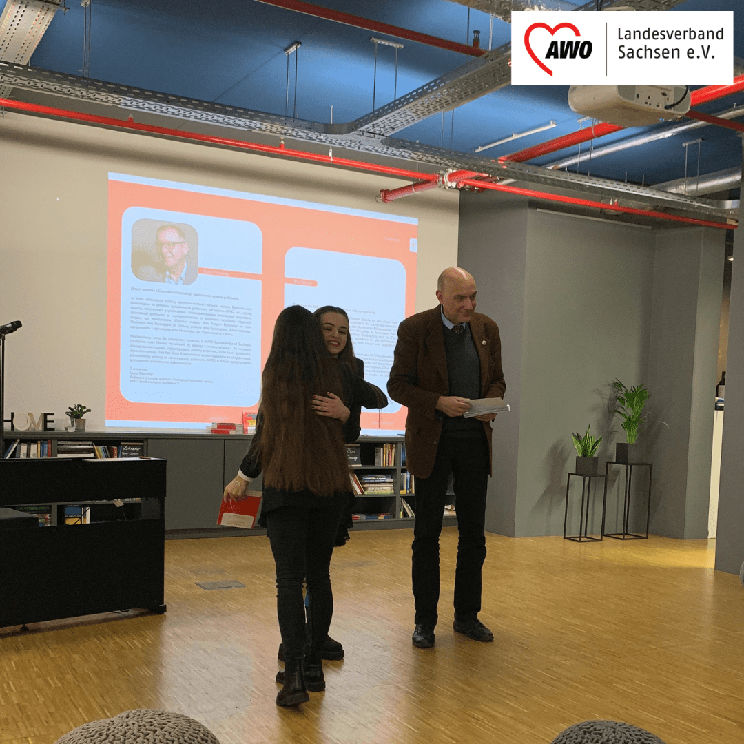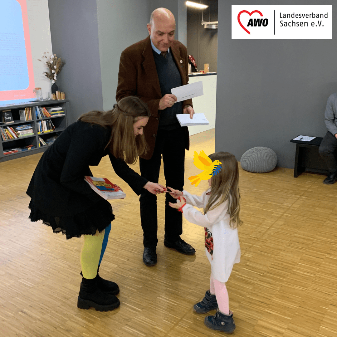 Nicole Chumakova, Koordinatorin der „AWO Ukraine-Hilfe“, und Martin Chidiac, Vorsitzender des AWO Kreisverbandes Dresden haben die Broschüre in die Hände der Kinder und Jugendlichen überreicht.