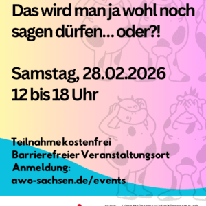 Teilnahme ausschließlich für Freiwillige der AWO Sachsen. In diesem Seminar geht es um Gewalt in der Behindertenhilfe und Gewaltschutz. Wir tauschen uns aus, was Gewalt ist, woran wir Gewalt erkennen, welche Auswirkungen es auf die betroffenen Menschen hat und was wir tun können, um Gewalt zu verhindern. Gemeinsam möchten wir sensibilisieren und Wege finden, wie...