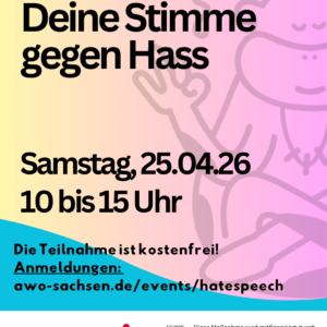Hate Speech ist mehr als nur ein Kommentar. In unserem Workshop „Deine Stimme gegen Hass“ schauen wir gemeinsam darauf, was Hassrede eigentlich ist, wie sie wirkt und welche sprachlichen Strategien dahinterstecken. Wann? 25.04.2026, 10:00–15:00 Uhr Referentin: Annabell Hellwig Wo: Herbert-Wehner-Haus, Devrientstraße 7, Dresden (Der Veranstaltungsort ist barrierefrei) Für wen: Jugendliche und junge Erwachsene bis 30...
